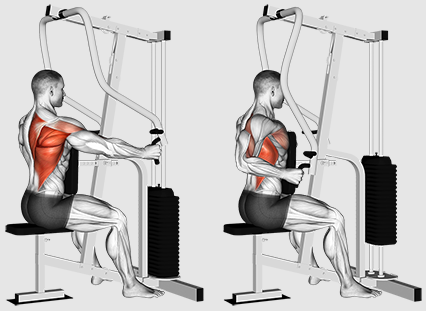அமர்ந்த வரிசை இயந்திரம். தடிமன் கட்டுவதற்கான முக்கிய உடற்பயிற்சி. 8–12 பிரதிநிதிகளின் 4–6 செட் செய்யுங்கள்.